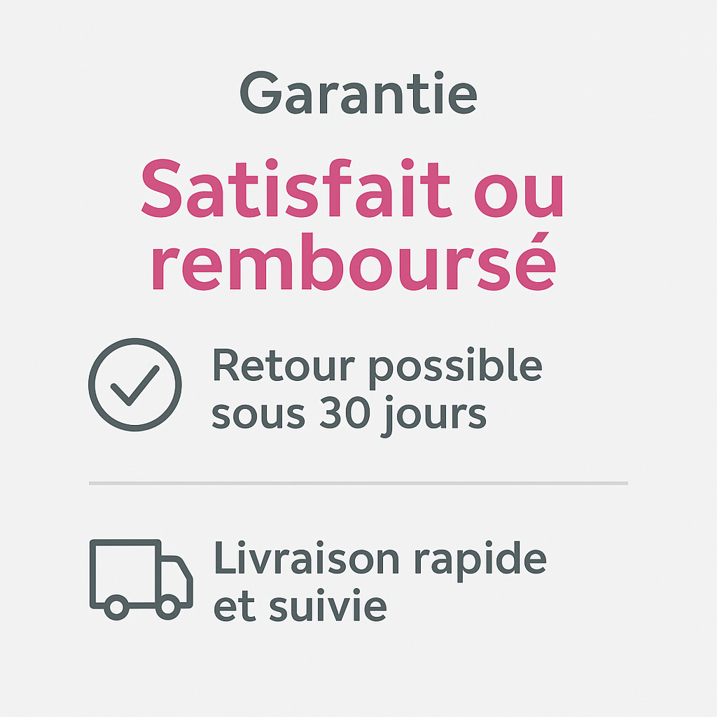 Vos commandes sont généralement livrées sous 5 à 10 jours ouvrables. De plus, nous offrons une politique de retour de 30 jours : si vous n'êtes pas entièrement satisfait, vous pouvez retourner les articles non utilisés dans leur emballage d'origine pour un remboursement ou un échange. Votre satisfaction est notre priorité.